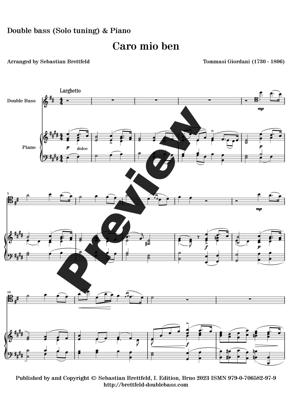 T. Giordani - Caro mio ben, parts for Double bass (Solo tuning) and Piano, arranged by Sebastian Brettfeld