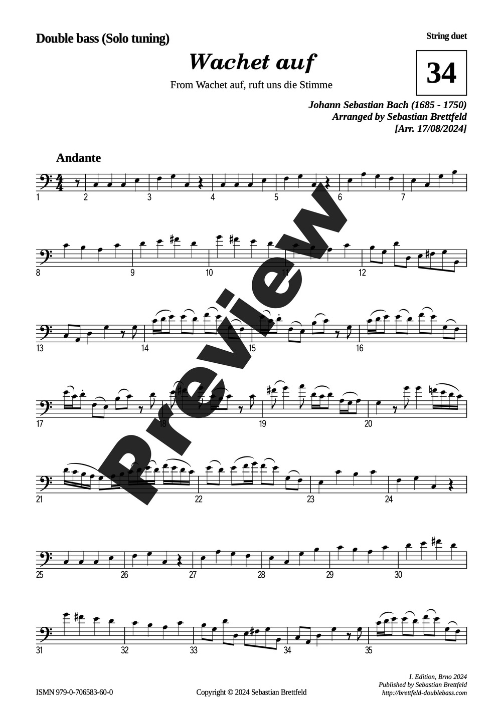 J. S. Bach - Wachet auf, arr. for Double bass (Solo tuning, Viennese tuning) with Violin, Viola or Violoncello