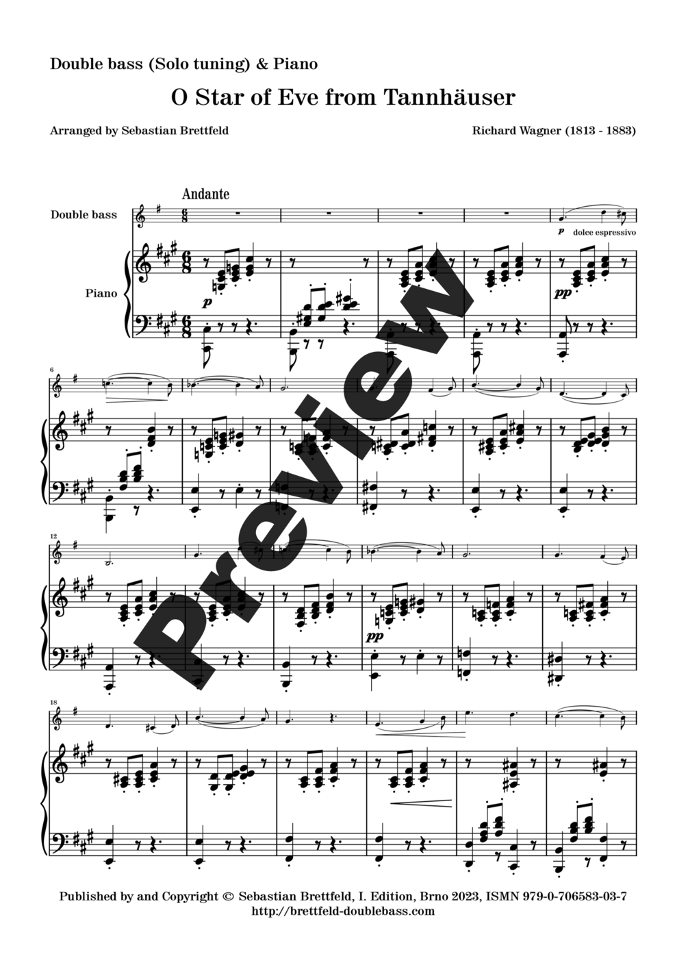 R. Wagner - O Star of Eve from Tannhäuser, parts for Double bass (Solo tuning) and Piano, arranged by Sebastian Brettfeld.